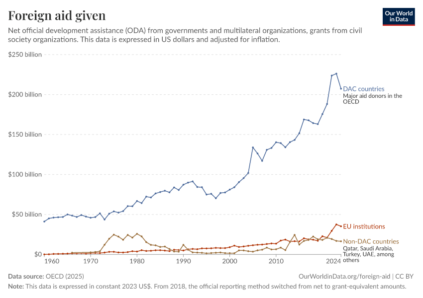 OECD (2025) – with major processing by Our World in Data. “Foreign aid given – Net disbursements” [dataset]. OECD, “OECD Official Development Assistance (ODA) - DAC1: Flows by provider (ODA+OOF+Private)”; OECD, “OECD Official Development Assistance (ODA) - DAC2A: Aid (ODA) disbursements to countries and regions” [original data]. Retrieved March 2, 2026 from https://data-measles-pipeline-fix.owid.pages.dev:8789/20260223-070107/grapher/foreign-aid-given-net.html (archived on February 23, 2026).