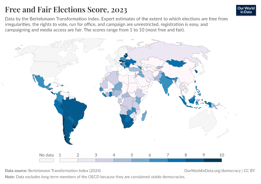 Bertelsmann Transformation Index (2024) – processed by Our World in Data. “Free and Fair Elections Score” [dataset]. Bertelsmann Transformation Index, “Bertelsmann Transformation Index, Scores” [original data]. Retrieved March 2, 2026 from https://data-measles-pipeline-fix.owid.pages.dev:8789/20260204-170225/grapher/free-fair-elections-bti.html (archived on February 4, 2026).