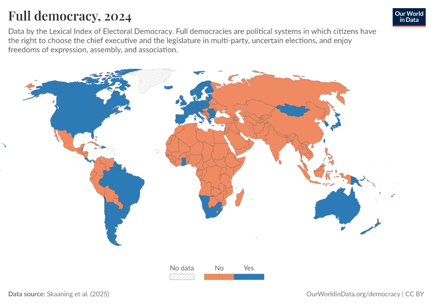 Skaaning et al. (2025) – processed by Our World in Data. “Full democracy” [dataset]. Skaaning et al., “Lexical Index of Electoral Democracy (LIED) v6.8” [original data]. Retrieved March 2, 2026 from https://data-measles-pipeline-fix.owid.pages.dev:8789/20260119-065148/grapher/full-democracy-lexical.html (archived on January 19, 2026).