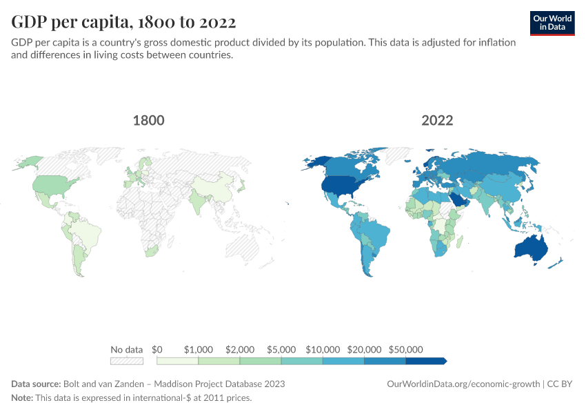 “Data Page: GDP per capita”, part of the following publication: Max Roser, Bertha Rohenkohl, Pablo Arriagada, Joe Hasell, Hannah Ritchie, and Esteban Ortiz-Ospina (2023) - “Economic Growth”. Data adapted from Bolt and van Zanden. Retrieved from https://data-measles-pipeline-fix.owid.pages.dev:8789/20251111-144738/grapher/gdp-per-capita-maddison-project-database.html [online resource] (archived on November 11, 2025).