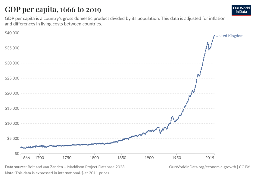 “Data Page: GDP per capita”, part of the following publication: Max Roser, Bertha Rohenkohl, Pablo Arriagada, Joe Hasell, Hannah Ritchie, and Esteban Ortiz-Ospina (2023) - “Economic Growth”. Data adapted from Bolt and van Zanden. Retrieved from https://data-measles-pipeline-fix.owid.pages.dev:8789/20251111-144738/grapher/gdp-per-capita-maddison-project-database.html [online resource] (archived on November 11, 2025).