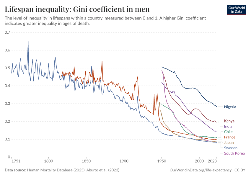“Data Page: Lifespan inequality: Gini coefficient in men”, part of the following publication: Saloni Dattani, Lucas Rodés-Guirao, Hannah Ritchie, Esteban Ortiz-Ospina, and Max Roser (2023) - “Life Expectancy”. Data adapted from Human Mortality Database, United Nations. Retrieved from https://data-measles-pipeline-fix.owid.pages.dev:8789/20251022-222946/grapher/gini-coefficient-of-lifespan-inequality-in-males.html [online resource] (archived on October 22, 2025).How to cite this data