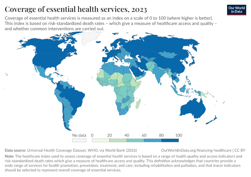 “Data Page: Coverage of essential health services”. Our World in Data (2026). Data adapted from Universal Health Coverage Dataset, WHO, via World Bank. Retrieved from https://data-measles-pipeline-fix.owid.pages.dev:8789/20260202-181317/grapher/healthcare-access-quality-un.html [online resource] (archived on February 2, 2026).How to cite this data
