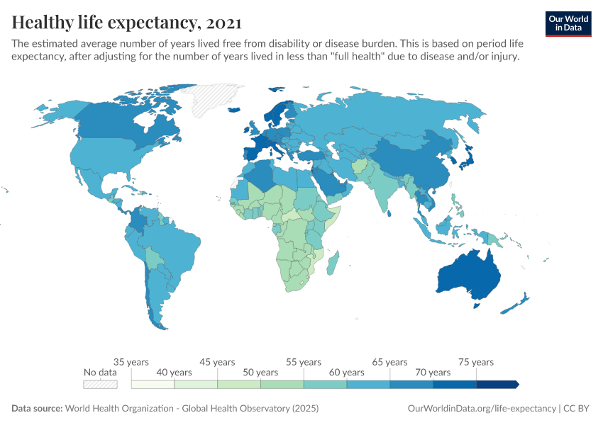 “Data Page: Healthy life expectancy”. Our World in Data (2026). Data adapted from World Health Organization. Retrieved from https://data-measles-pipeline-fix.owid.pages.dev:8789/20260119-070102/grapher/healthy-life-expectancy-at-birth.html [online resource] (archived on January 19, 2026).How to cite this data