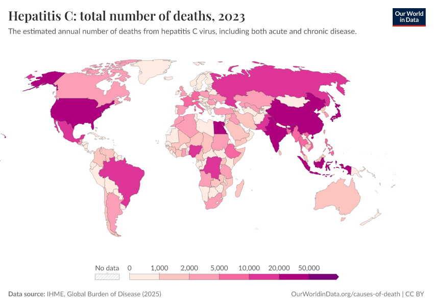 “Data Page: Hepatitis C: total number of deaths”, part of the following publication: Esteban Ortiz-Ospina and Max Roser (2016) - “Global Health”. Data adapted from IHME, Global Burden of Disease. Retrieved from https://data-measles-pipeline-fix.owid.pages.dev:8789/20260211-174736/grapher/hepatitis-c-number-of-deaths.html [online resource] (archived on February 11, 2026).How to cite this data
