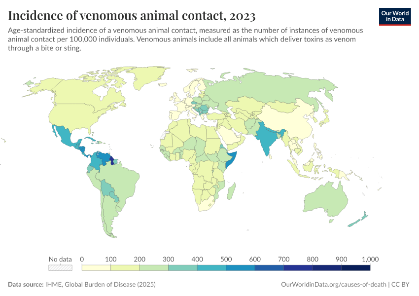 “Data Page: Incidence of venomous animal contact”, part of the following publication: Esteban Ortiz-Ospina and Max Roser (2016) - “Global Health”. Data adapted from IHME, Global Burden of Disease. Retrieved from https://data-measles-pipeline-fix.owid.pages.dev:8789/20260212-172132/grapher/incidence-of-venomous-animal-contact.html [online resource] (archived on February 12, 2026).How to cite this data