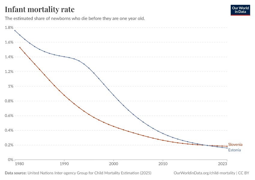 United Nations Inter-agency Group for Child Mortality Estimation (2025) – with minor processing by Our World in Data. “Infant mortality rate” [dataset]. United Nations Inter-agency Group for Child Mortality Estimation, “United Nations Inter-agency Group for Child Mortality Estimation”; Various sources, “Population” [original data]. Retrieved March 2, 2026 from https://data-measles-pipeline-fix.owid.pages.dev:8789/20260119-070102/grapher/infant-mortality.html (archived on January 19, 2026).