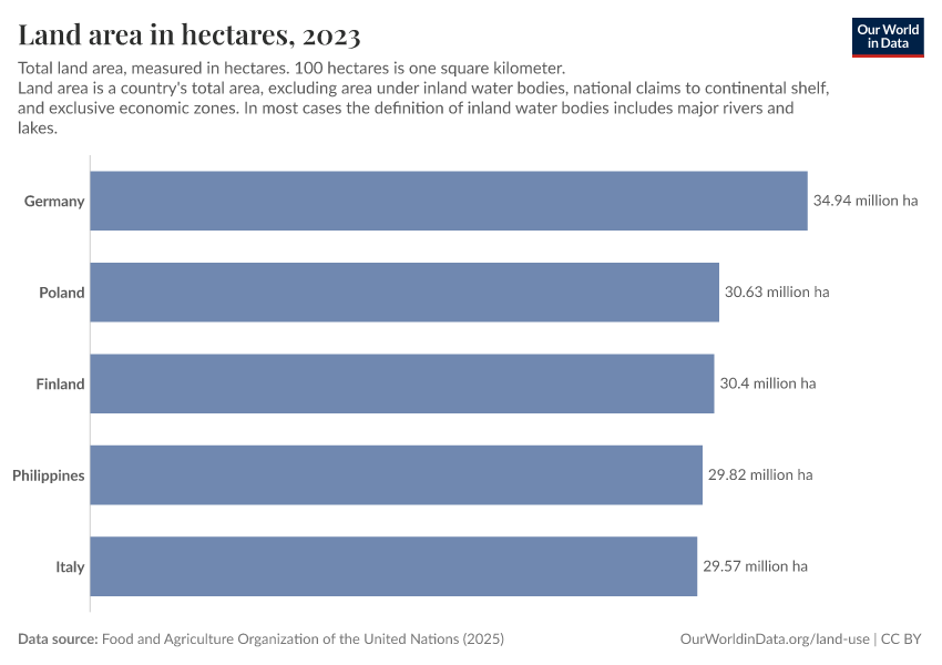 Food and Agriculture Organization of the United Nations (2025) – with major processing by Our World in Data. “Land area in hectares – UN FAO” [dataset]. Food and Agriculture Organization of the United Nations, “Land, Inputs and Sustainability: Land Use” [original data]. Retrieved March 2, 2026 from https://data-measles-pipeline-fix.owid.pages.dev:8789/20260226-122020/grapher/land-area-hectares.html (archived on February 26, 2026).