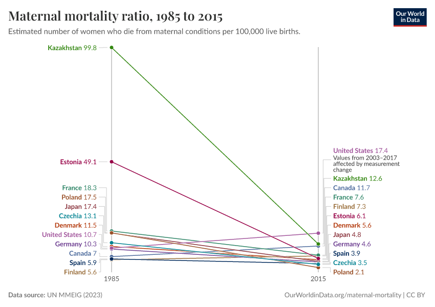UN MMEIG (2023) – processed by Our World in Data. “Maternal mortality ratio” [dataset]. UN MMEIG (WHO, UNICEF, UNFPA, World Bank Group and UNDESA/ Population Division), “Trends in maternal mortality 2020” [original data]. Retrieved March 2, 2026 from https://data-measles-pipeline-fix.owid.pages.dev:8789/20260119-065148/grapher/maternal-mortality-slope-chart.html (archived on January 19, 2026).