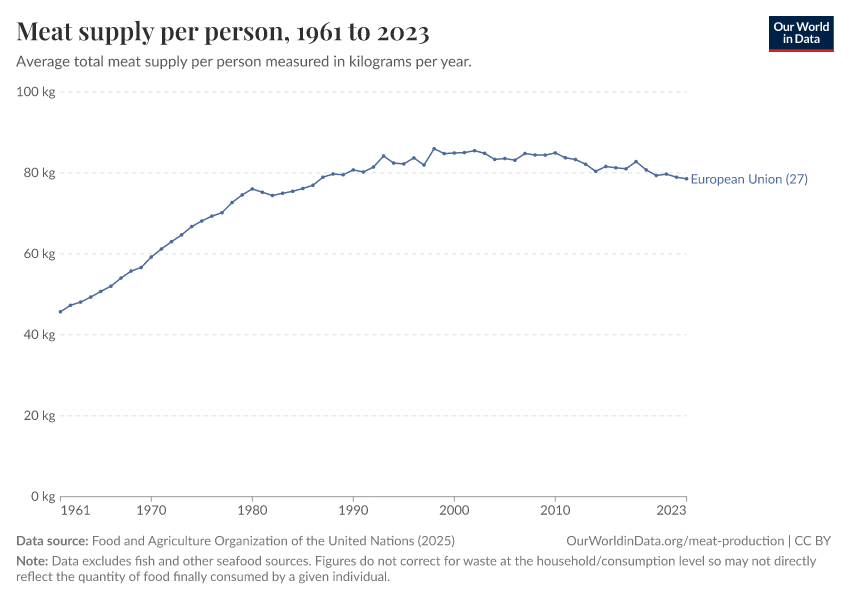 Food and Agriculture Organization of the United Nations (2025) – processed by Our World in Data. “Yearly per capita supply of all meat” [dataset]. Food and Agriculture Organization of the United Nations, “Food Balances: Food Balances (-2013, old methodology and population)”; Food and Agriculture Organization of the United Nations, “Food Balances: Food Balances (2010-)” [original data]. Retrieved March 2, 2026 from https://data-measles-pipeline-fix.owid.pages.dev:8789/20260226-122020/grapher/meat-supply-per-person.html (archived on February 26, 2026).