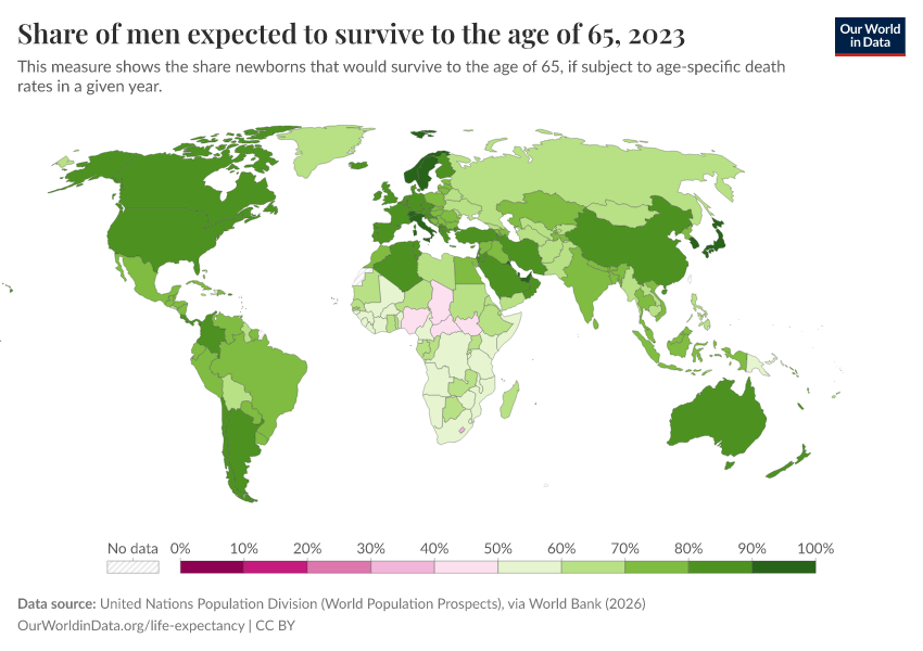 “Data Page: Share of men expected to survive to the age of 65”. Our World in Data (2026). Data adapted from United Nations Population Division (World Population Prospects), via World Bank. Retrieved from https://data-measles-pipeline-fix.owid.pages.dev:8789/20260202-181317/grapher/men-survival-to-age-65.html [online resource] (archived on February 2, 2026).How to cite this data
