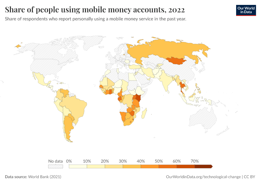 World Bank (2021) – with minor processing by Our World in Data. “Share of people using mobile money accounts” [dataset]. World Bank, “The Global Findex Database” [original data]. Retrieved March 2, 2026 from https://data-measles-pipeline-fix.owid.pages.dev:8789/20250909-093708/grapher/mobile-money-account-usage.html (archived on September 9, 2025).