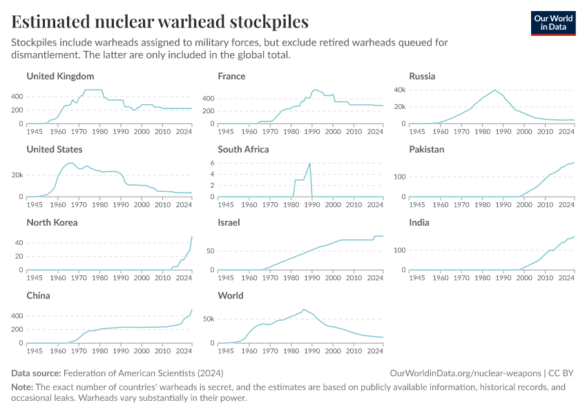 Federation of American Scientists (2024) – with minor processing by Our World in Data. “Estimated nuclear warhead stockpiles” [dataset]. Federation of American Scientists, “Estimated Global Nuclear Warhead Inventories” [original data]. Retrieved March 2, 2026 from https://data-measles-pipeline-fix.owid.pages.dev:8789/20250909-093708/grapher/nuclear-warhead-stockpiles-lines.html (archived on September 9, 2025).