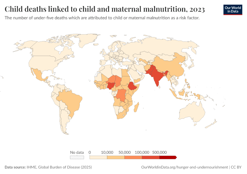 IHME, Global Burden of Disease (2025) – with major processing by Our World in Data. “Child deaths linked to child and maternal malnutrition” [dataset]. IHME, Global Burden of Disease, “Global Burden of Disease - Risk Factors - Deaths” [original data]. Retrieved March 2, 2026 from https://data-measles-pipeline-fix.owid.pages.dev:8789/20260213-112438/grapher/number-child-deaths-malnutrition.html (archived on February 13, 2026).