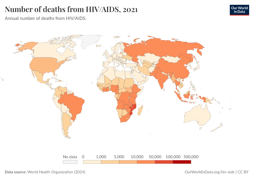 World Health Organization (2024) – with major processing by Our World in Data. “Number of deaths from HIV/AIDS” [dataset]. World Health Organization, “Global Health Estimates” [original data]. Retrieved March 2, 2026 from https://data-measles-pipeline-fix.owid.pages.dev:8789/20250909-093708/grapher/number-of-deaths-from-hivaids-who.html (archived on September 9, 2025).
