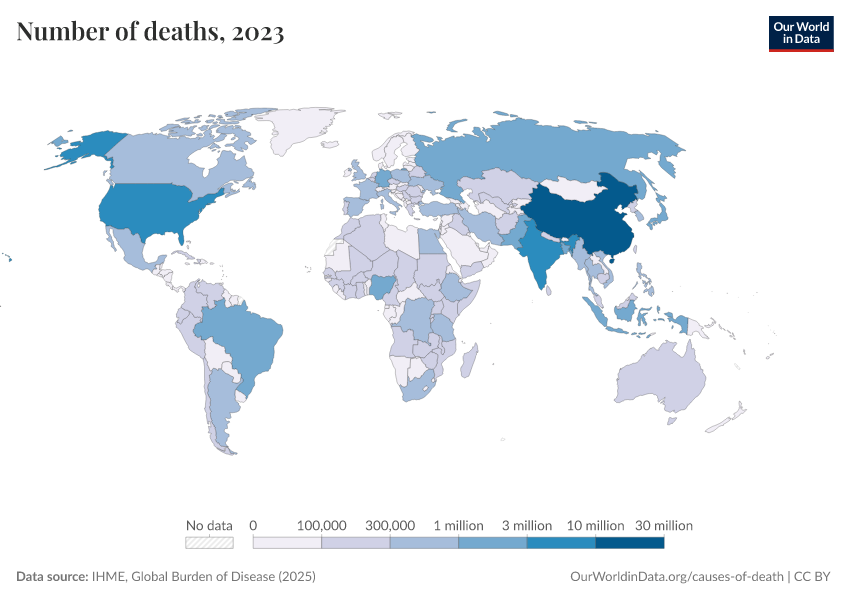 “Data Page: Number of deaths”, part of the following publication: Esteban Ortiz-Ospina and Max Roser (2016) - “Global Health”. Data adapted from IHME, Global Burden of Disease. Retrieved from https://data-measles-pipeline-fix.owid.pages.dev:8789/20260211-174736/grapher/number-of-deaths-gbd.html [online resource] (archived on February 11, 2026).How to cite this data