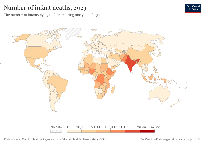 World Health Organization - Global Health Observatory (2025) – processed by Our World in Data. “Number of infant deaths” [dataset]. World Health Organization, “Global Health Observatory” [original data]. Retrieved March 2, 2026 from https://data-measles-pipeline-fix.owid.pages.dev:8789/20260119-070102/grapher/number-of-infant-deaths-gho.html (archived on January 19, 2026).