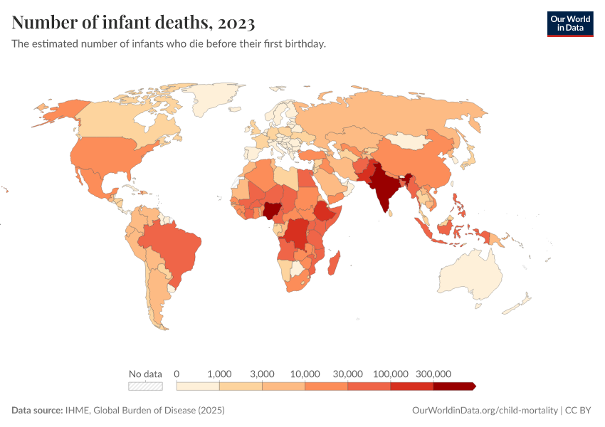 IHME, Global Burden of Disease (2025) – with minor processing by Our World in Data. “Number of infant deaths” [dataset]. IHME, Global Burden of Disease, “Global Burden of Disease - Child Mortality” [original data]. Retrieved March 2, 2026 from https://data-measles-pipeline-fix.owid.pages.dev:8789/20260213-140117/grapher/number-of-infant-deaths-ihme.html (archived on February 13, 2026).