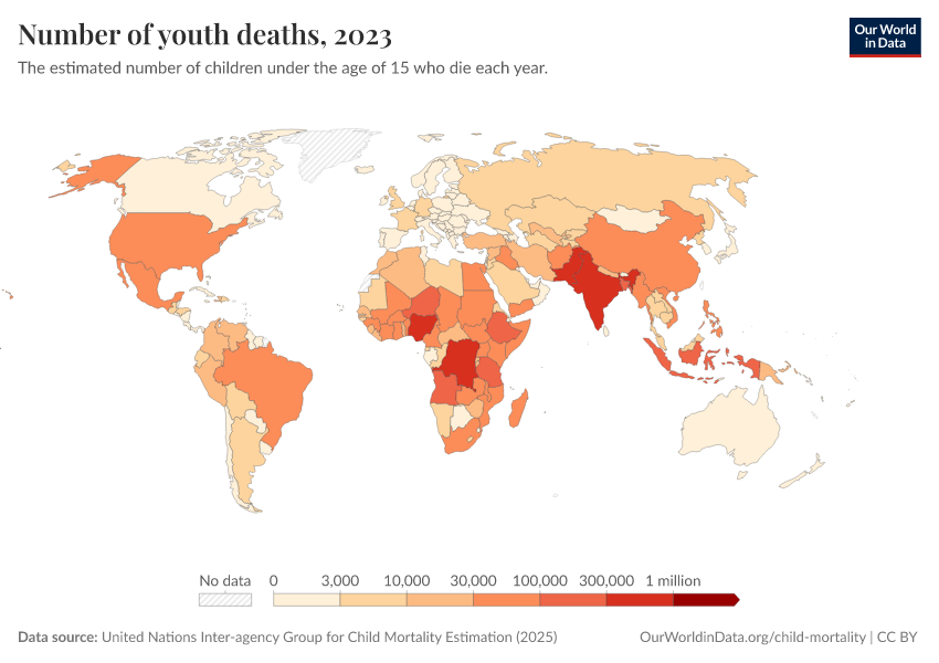 United Nations Inter-agency Group for Child Mortality Estimation (2025) – with minor processing by Our World in Data. “Under-fifteen deaths” [dataset]. United Nations Inter-agency Group for Child Mortality Estimation, “United Nations Inter-agency Group for Child Mortality Estimation”; UN Inter-agency Group for Child Mortality Estimation, “Child Mortality Estimates 2018”; Various sources, “Population” [original data]. Retrieved March 2, 2026 from https://data-measles-pipeline-fix.owid.pages.dev:8789/20260223-071105/grapher/number-of-youth-deaths.html (archived on February 23, 2026).
