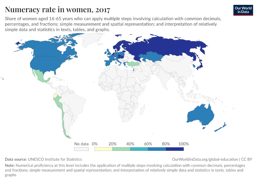 “Data Page: Numeracy rate in women”. Our World in Data (2026). Data adapted from UNESCO Institute for Statistics. Retrieved from https://data-measles-pipeline-fix.owid.pages.dev:8789/20260105-133053/grapher/numeracy-rate-in-adult-women-sdg.html [online resource] (archived on January 5, 2026).How to cite this data