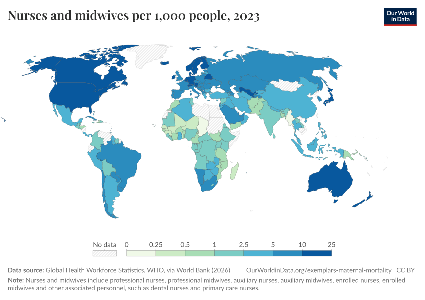 “Data Page: Nurses and midwives per 1,000 people”. Our World in Data (2026). Data adapted from Global Health Workforce Statistics, WHO, via World Bank. Retrieved from https://data-measles-pipeline-fix.owid.pages.dev:8789/20260202-181317/grapher/nurses-and-midwives-per-1000-people.html [online resource] (archived on February 2, 2026).How to cite this data