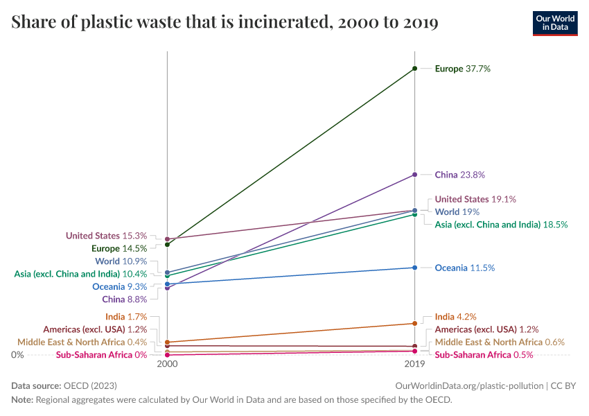 “Data Page: Share of plastic waste that is incinerated”, part of the following publication: Hannah Ritchie, Veronika Samborska, and Max Roser (2023) - “Plastic Pollution”. Data adapted from OECD. Retrieved from https://data-measles-pipeline-fix.owid.pages.dev:8789/20250909-093708/grapher/plastic-waste-incinerated.html [online resource] (archived on September 9, 2025).How to cite this data