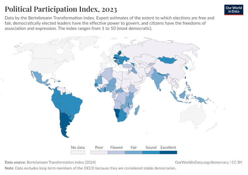 “Data Page: Political Participation Index”, part of the following publication: Bastian Herre, Lucas Rodés-Guirao, and Esteban Ortiz-Ospina (2013) - “Democracy”. Data adapted from Bertelsmann Transformation Index. Retrieved from https://data-measles-pipeline-fix.owid.pages.dev:8789/20260105-133053/grapher/political-participation-index-bti.html [online resource] (archived on January 5, 2026).How to cite this data