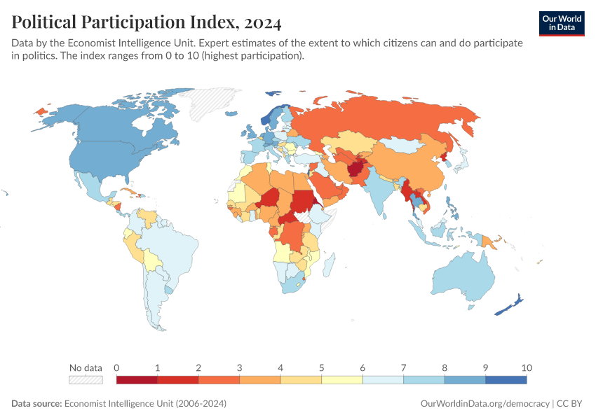 Economist Intelligence Unit (2006-2024) – processed by Our World in Data. “Political Participation Index” [dataset]. Economist Intelligence Unit, “Democracy Index 2021: The China challenge”; Economist Intelligence Unit, “Democracy Index 2022: Frontline democracy and the battle for Ukraine”; Economist Intelligence Unit, “Democracy Index 2023: Age of Conflict”; Economist Intelligence Unit, “Democracy Index 2024: What's wrong with representative democracy?”; Gapminder, “Democracy Index v4”; Various sources, “Population” [original data]. Retrieved March 2, 2026 from https://data-measles-pipeline-fix.owid.pages.dev:8789/20260119-070102/grapher/political-participation-index-eiu.html (archived on January 19, 2026).
