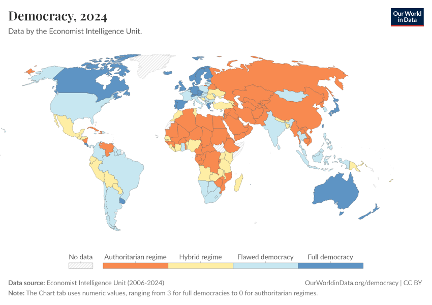 Economist Intelligence Unit (2006-2024) – processed by Our World in Data. “Democracy” [dataset]. Economist Intelligence Unit, “Democracy Index 2021: The China challenge”; Economist Intelligence Unit, “Democracy Index 2022: Frontline democracy and the battle for Ukraine”; Economist Intelligence Unit, “Democracy Index 2023: Age of Conflict”; Economist Intelligence Unit, “Democracy Index 2024: What's wrong with representative democracy?”; Gapminder, “Democracy Index v4” [original data]. Retrieved March 2, 2026 from https://data-measles-pipeline-fix.owid.pages.dev:8789/20260105-133053/grapher/political-regime-eiu.html (archived on January 5, 2026).