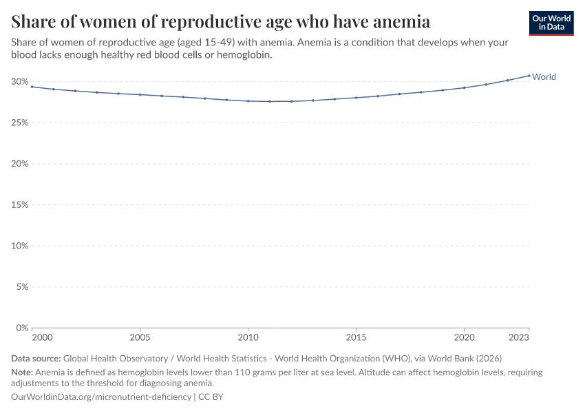 “Data Page: Share of women of reproductive age who have anemia”. Our World in Data (2026). Data adapted from Global Health Observatory / World Health Statistics - World Health Organization (WHO), via World Bank. Retrieved from https://data-measles-pipeline-fix.owid.pages.dev:8789/20260202-181317/grapher/prevalence-of-anemia-in-women-of-reproductive-age-aged-15-29.html [online resource] (archived on February 2, 2026).How to cite this data