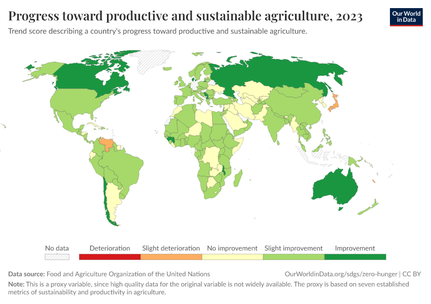 “Data Page: Progress toward productive and sustainable agriculture”. Our World in Data (2026). Data adapted from Food and Agriculture Organization of the United Nations. Retrieved from https://data-measles-pipeline-fix.owid.pages.dev:8789/20260130-180113/grapher/progress-toward-productive-and-sustainable-agriculture.html [online resource] (archived on January 30, 2026).How to cite this data
