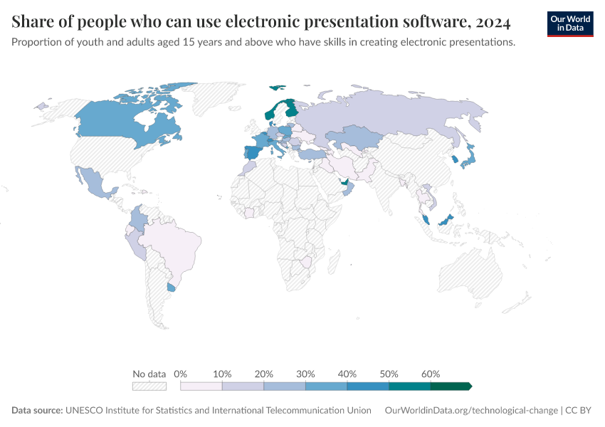 UNESCO Institute for Statistics and International Telecommunication Union – processed by Our World in Data. “Share of people who can use electronic presentation software” [dataset]. UNESCO Institute for Statistics and International Telecommunication Union, “Data from multiple sources” [original data]. Retrieved March 2, 2026 from https://data-measles-pipeline-fix.owid.pages.dev:8789/20251120-211038/grapher/proportion-with-ict-skills-in-presentations.html (archived on November 20, 2025).