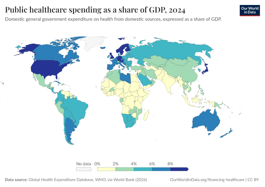 “Data Page: Public healthcare spending as a share of GDP”. Our World in Data (2026). Data adapted from Global Health Expenditure Database, WHO, via World Bank. Retrieved from https://data-measles-pipeline-fix.owid.pages.dev:8789/20260202-181317/grapher/public-healthcare-spending-share-gdp.html [online resource] (archived on February 2, 2026).How to cite this data