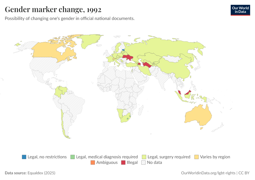 “Data Page: Gender marker change”, part of the following publication: Bastian Herre and Pablo Arriagada (2023) - “LGBT+ Rights”. Data adapted from Equaldex. Retrieved from https://data-measles-pipeline-fix.owid.pages.dev:8789/20250909-093708/grapher/right-to-change-legal-gender-equaldex.html [online resource] (archived on September 9, 2025).How to cite this data
