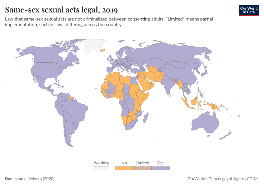 “Data Page: Same-sex sexual acts legal”, part of the following publication: Bastian Herre and Pablo Arriagada (2023) - “LGBT+ Rights”. Data adapted from Velasco. Retrieved from https://data-measles-pipeline-fix.owid.pages.dev:8789/20251023-195030/grapher/same-sex-sexual-acts-legal.html [online resource] (archived on October 23, 2025).How to cite this data