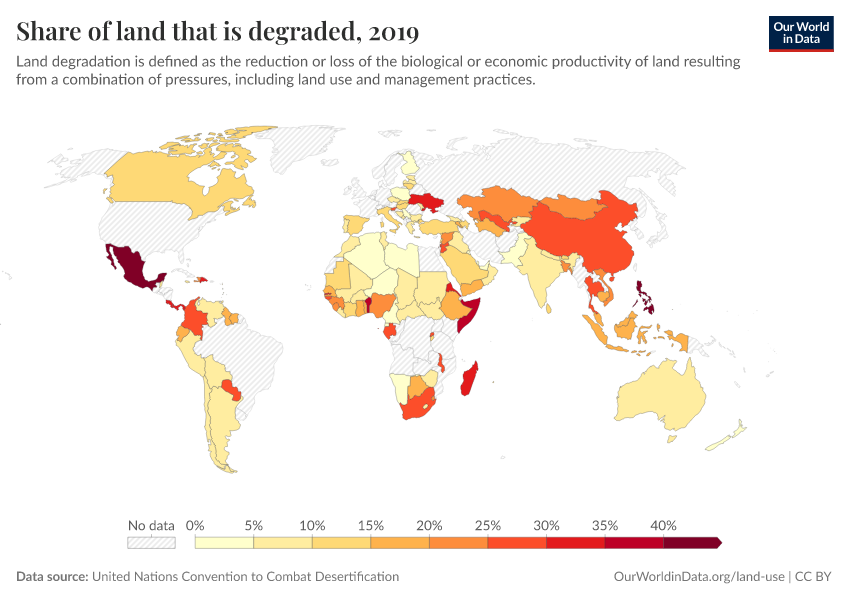 “Data Page: Share of land that is degraded”. Our World in Data (2026). Data adapted from United Nations Convention to Combat Desertification. Retrieved from https://data-measles-pipeline-fix.owid.pages.dev:8789/20260130-180113/grapher/share-degraded-land.html [online resource] (archived on January 30, 2026).How to cite this data