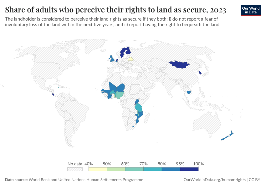 “Data Page: Share of adults who perceive their rights to land as secure”. Our World in Data (2026). Data adapted from World Bank and United Nations Human Settlements Programme. Retrieved from https://data-measles-pipeline-fix.owid.pages.dev:8789/20251121-151713/grapher/share-of-adults-who-perceive-their-rights-to-land-as-secure.html [online resource] (archived on November 21, 2025).How to cite this data
