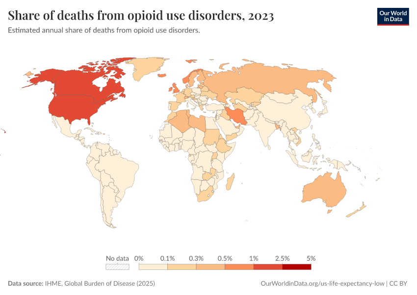 IHME, Global Burden of Disease (2025) – with major processing by Our World in Data. “Share of deaths from opioid use disorders” [dataset]. IHME, Global Burden of Disease, “Global Burden of Disease - Deaths” [original data]. Retrieved March 2, 2026 from https://data-measles-pipeline-fix.owid.pages.dev:8789/20260211-174736/grapher/share-of-deaths-from-opioid-overdoses.html (archived on February 11, 2026).