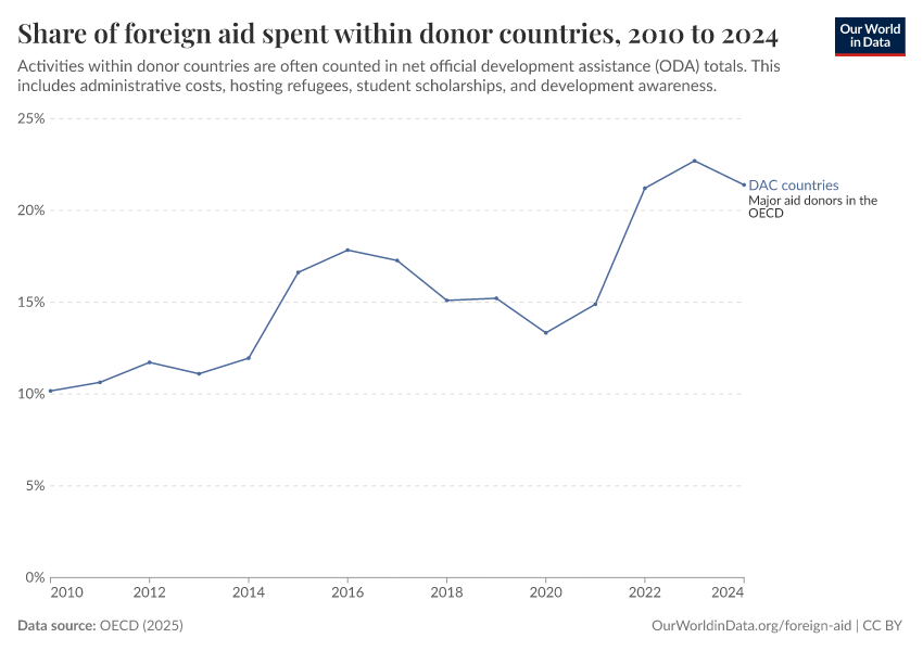 OECD (2025) – with minor processing by Our World in Data. “Share of foreign aid spent within donor countries – Net disbursements” [dataset]. OECD, “OECD Official Development Assistance (ODA) - DAC1: Flows by provider (ODA+OOF+Private)” [original data]. Retrieved March 2, 2026 from https://data-measles-pipeline-fix.owid.pages.dev:8789/20251230-141326/grapher/share-of-foreign-aid-spent-within-donor-countries.html (archived on December 30, 2025).