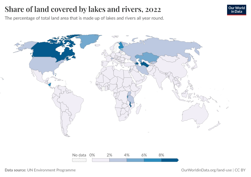 “Data Page: Share of land covered by lakes and rivers”. Our World in Data (2026). Data adapted from UN Environment Programme. Retrieved from https://data-measles-pipeline-fix.owid.pages.dev:8789/20260130-180113/grapher/share-of-land-covered-by-lakes-and-rivers.html [online resource] (archived on January 30, 2026).How to cite this data
