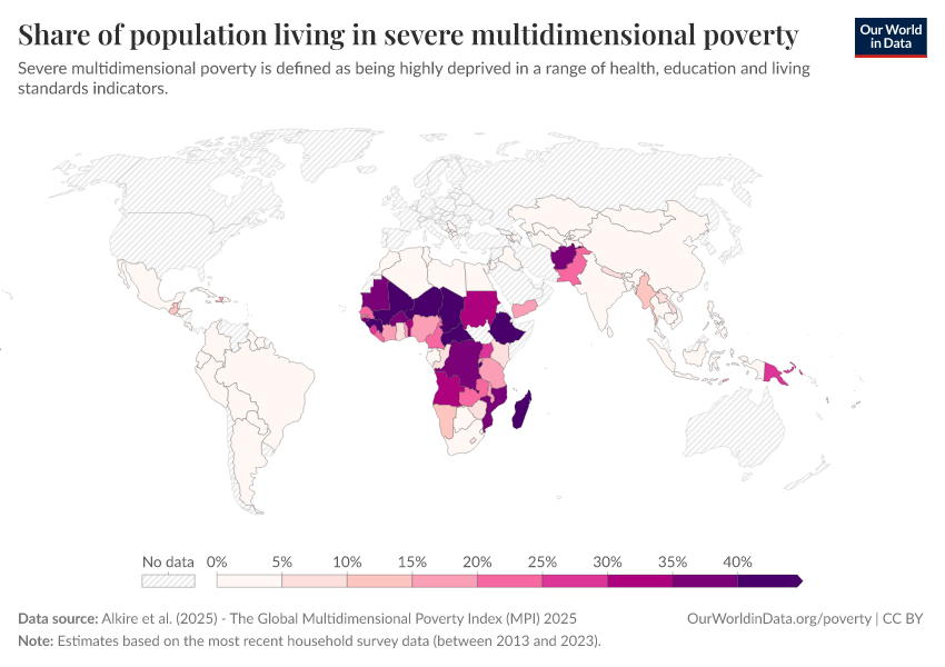 “Data Page: Share of population living in severe multidimensional poverty”, part of the following publication: Joe Hasell, Bertha Rohenkohl, Pablo Arriagada, Esteban Ortiz-Ospina, and Max Roser (2022) - “Poverty”. Data adapted from Alkire et al.. Retrieved from https://data-measles-pipeline-fix.owid.pages.dev:8789/20251229-175603/grapher/share-of-population-in-severe-multidimensional-poverty.html [online resource] (archived on December 29, 2025).How to cite this data