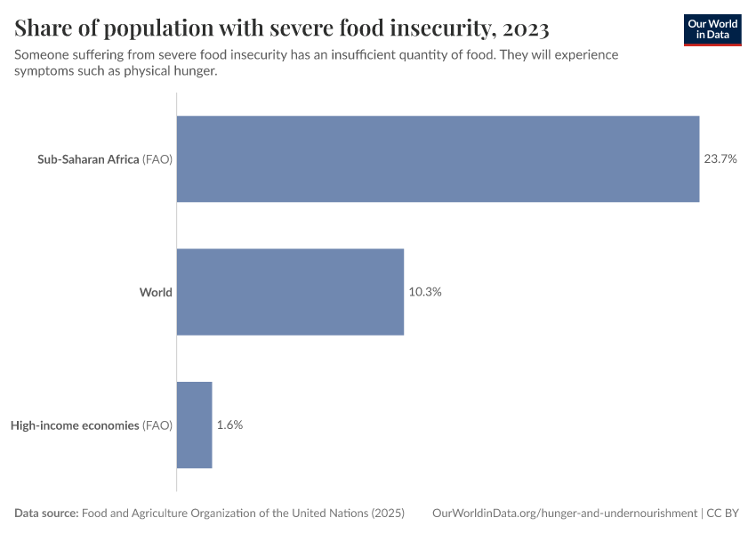 Food and Agriculture Organization of the United Nations (2025) – with major processing by Our World in Data. “Prevalence of severe food insecurity in the total population – UN FAO – 3-year average” [dataset]. Food and Agriculture Organization of the United Nations, “Food Security and Nutrition: Suite of Food Security Indicators” [original data]. Retrieved March 2, 2026 from https://data-measles-pipeline-fix.owid.pages.dev:8789/20260226-122020/grapher/share-of-population-with-severe-food-insecurity.html (archived on February 26, 2026).