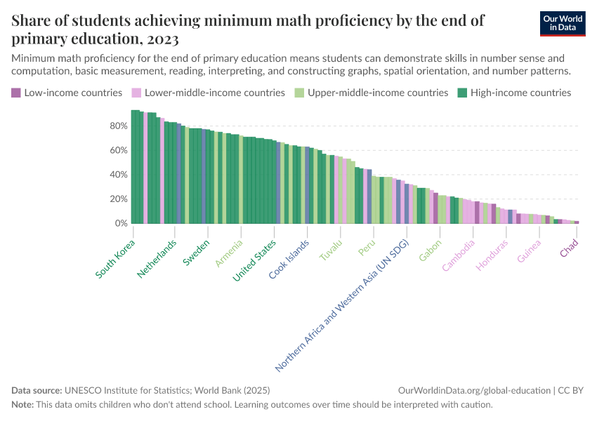 UNESCO Institute for Statistics – processed by Our World in Data. “Share of students achieving minimum math proficiency by the end of primary education” [dataset]. UNESCO Institute for Statistics, “Data from multiple sources” [original data]. Retrieved March 2, 2026 from https://data-measles-pipeline-fix.owid.pages.dev:8789/20260130-180113/grapher/share-of-students-at-end-of-primary-education-achieving-minimum-math-proficiency.html (archived on January 30, 2026).