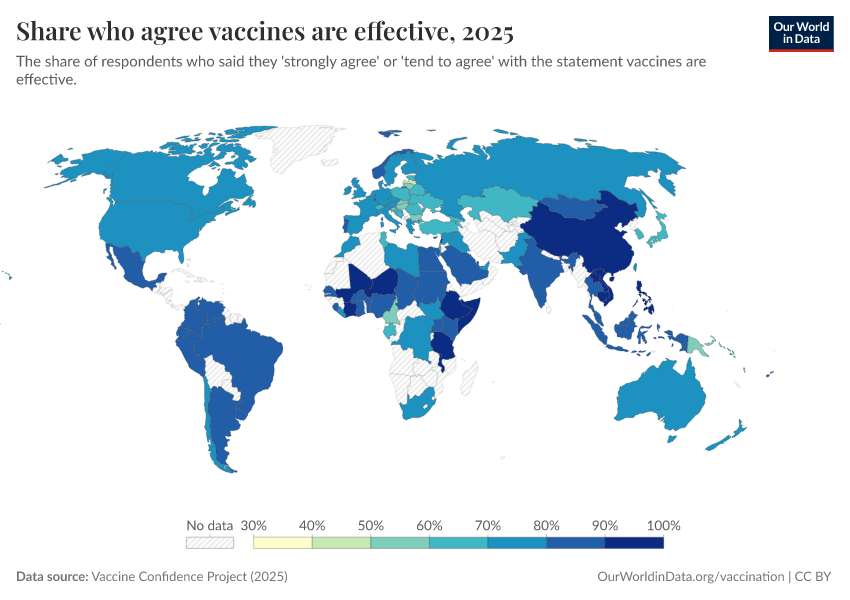 Vaccine Confidence Project (2025) – processed by Our World in Data. “Share who agree vaccines are effective” [dataset]. Vaccine Confidence Project, “Vaccine Confidence Index” [original data]. Retrieved March 2, 2026 from https://data-measles-pipeline-fix.owid.pages.dev:8789/20250909-093708/grapher/share-who-agree-vaccines-are-effective.html (archived on September 9, 2025).