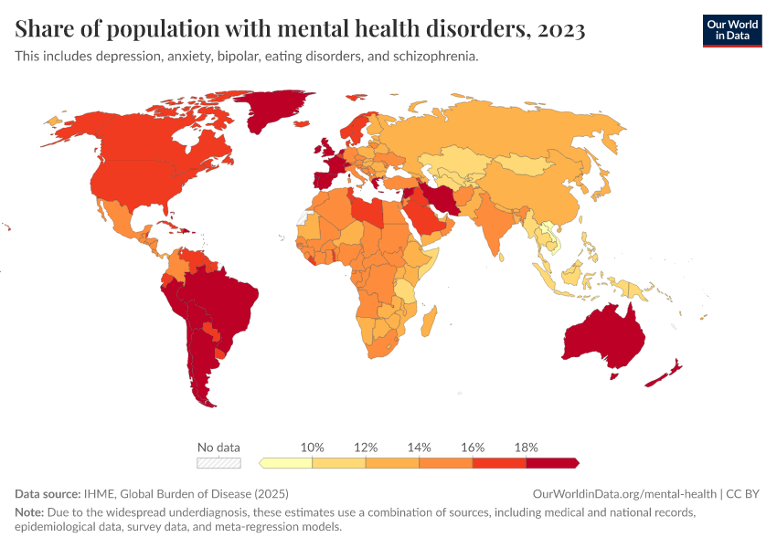 IHME, Global Burden of Disease (2025) – with major processing by Our World in Data. “Share of population with mental health disorders” [dataset]. IHME, Global Burden of Disease, “Global Burden of Disease - Prevalence and Incidence” [original data]. Retrieved March 2, 2026 from https://data-measles-pipeline-fix.owid.pages.dev:8789/20260212-172132/grapher/share-with-mental-and-substance-disorders.html (archived on February 12, 2026).