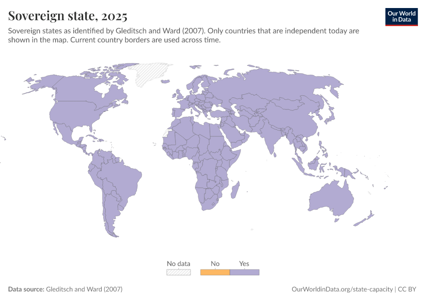 “Data Page: Sovereign state”, part of the following publication: Bastian Herre and Pablo Arriagada (2023) - “State Capacity”. Data adapted from Gleditsch and Ward. Retrieved from https://data-measles-pipeline-fix.owid.pages.dev:8789/20260119-070102/grapher/sovereign-state-gleditsch-ward.html [online resource] (archived on January 19, 2026).How to cite this data