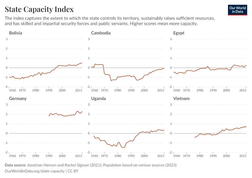 “Data Page: State Capacity Index”, part of the following publication: Bastian Herre and Pablo Arriagada (2023) - “State Capacity”. Data adapted from Jonathan Hanson and Rachel Sigman, Various sources. Retrieved from https://data-measles-pipeline-fix.owid.pages.dev:8789/20260223-071105/grapher/state-capacity-index.html [online resource] (archived on February 23, 2026).How to cite this data