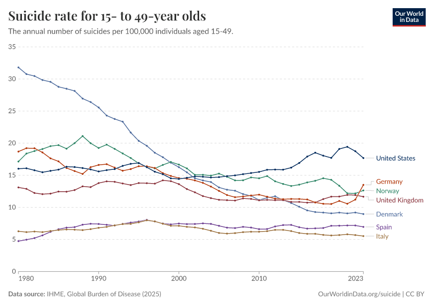 IHME, Global Burden of Disease (2025) – with major processing by Our World in Data. “Suicide rate for 15- to 49-year olds” [dataset]. IHME, Global Burden of Disease, “Global Burden of Disease - Deaths” [original data]. Retrieved March 2, 2026 from https://data-measles-pipeline-fix.owid.pages.dev:8789/20260211-174736/grapher/suicide-rate-for-15--to-49-year-olds.html (archived on February 11, 2026).