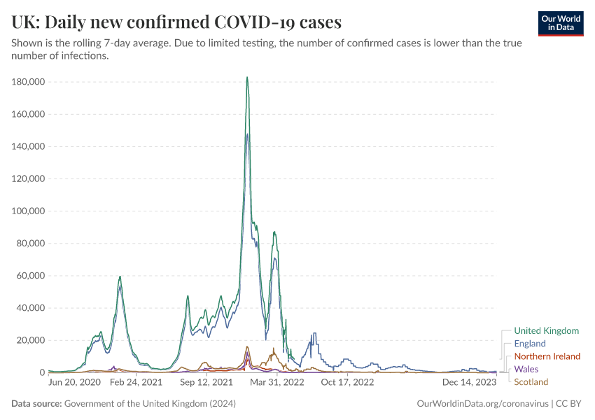 Government of the United Kingdom (2024) – with minor processing by Our World in Data. “UK: Daily new confirmed COVID-19 cases” [dataset]. Government of the United Kingdom, “UKHSA data dashboard” [original data]. Retrieved March 2, 2026 from https://data-measles-pipeline-fix.owid.pages.dev:8789/20250909-093708/grapher/uk-daily-new-covid-cases.html (archived on September 9, 2025).