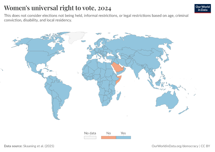 Skaaning et al. (2025) – processed by Our World in Data. “Women's universal right to vote” [dataset]. Skaaning et al., “Lexical Index of Electoral Democracy (LIED) v6.8” [original data]. Retrieved March 2, 2026 from https://data-measles-pipeline-fix.owid.pages.dev:8789/20260119-065148/grapher/universal-suffrage-women-lexical.html (archived on January 19, 2026).